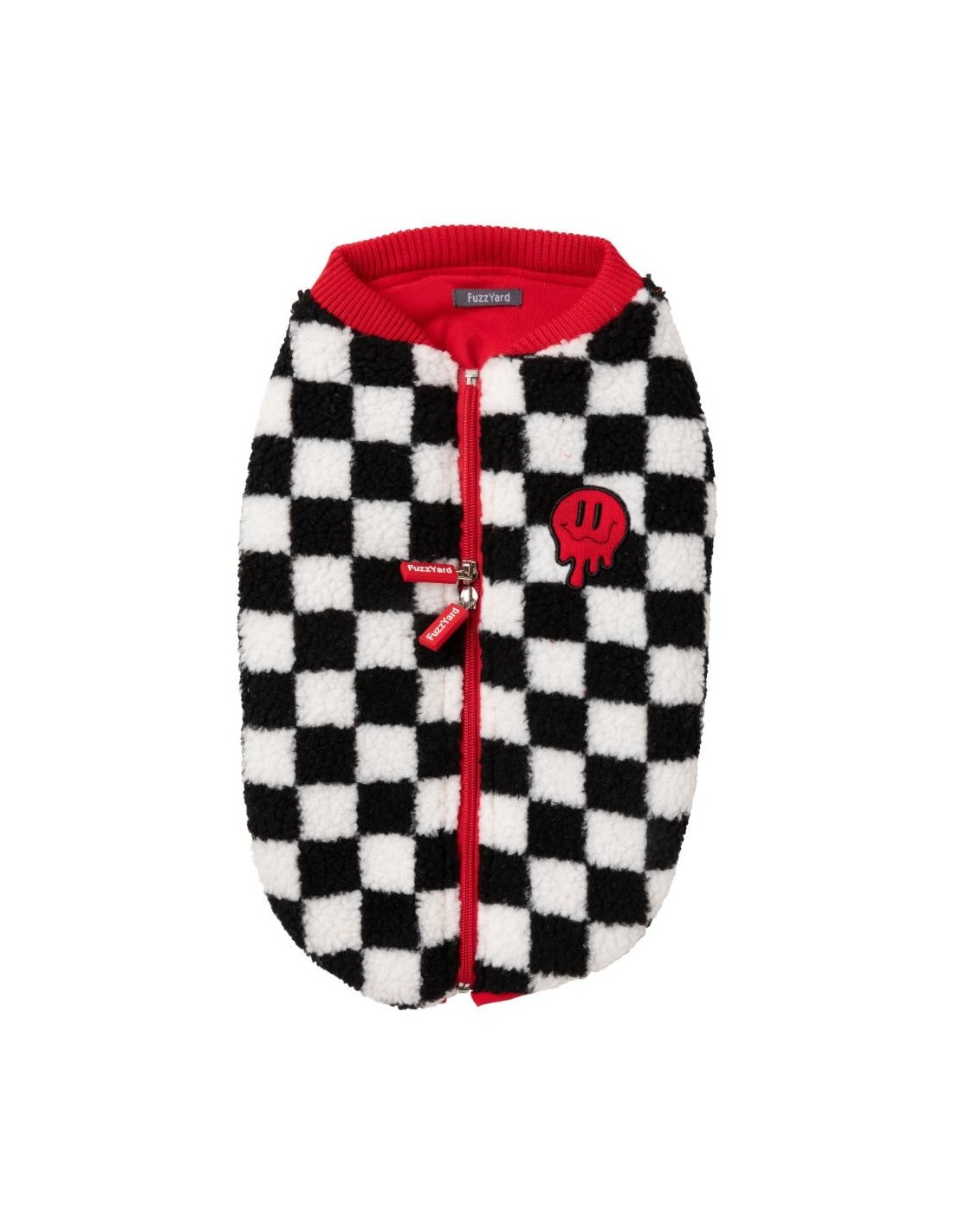 Además, incluye detalles inteligentes como un protector detrás del cierre para evitar que se atrape el pelaje, un panel elástico en el vientre para un ajuste cómodo y cremalleras dobles para acceder fácilmente al arnés o collar. El cuello acanalado añade un toque encantador y flexible, y el bordado de la carita sonriente derretida le da ese guiño divertido y único que distingue a FuzzYard.